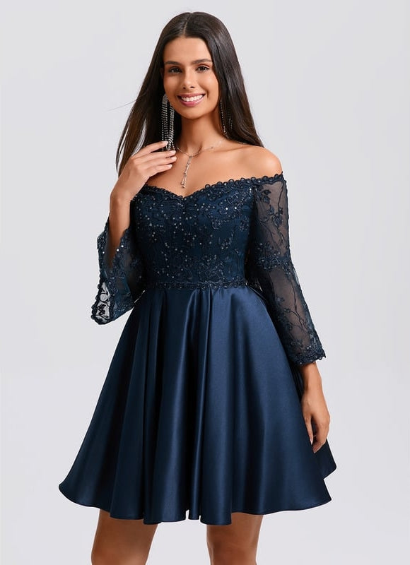 Cette Robe De Bal Satin Marine Embellie se distingue par son design sophistiqué et ses finitions impeccables. Son col épaule dénudée met en valeur votre cou et vos épaules avec une élégance intemporelle, tandis que la coupe trapèze offre une silhouette flatteuse et un confort inégalé, vous permettant de danser et de vous déplacer librement. Les manches longues évasées, délicatement ornées de dentelle et de paillettes, ajoutent une touche de raffinement et de mystère. Sa longueur courte apporte une touche de modernité et de légèreté, idéale pour les soirées où vous voulez vous sentir chic et insouciante. Chaque détail a été pensé pour vous offrir une allure à la fois tendance et confortable.