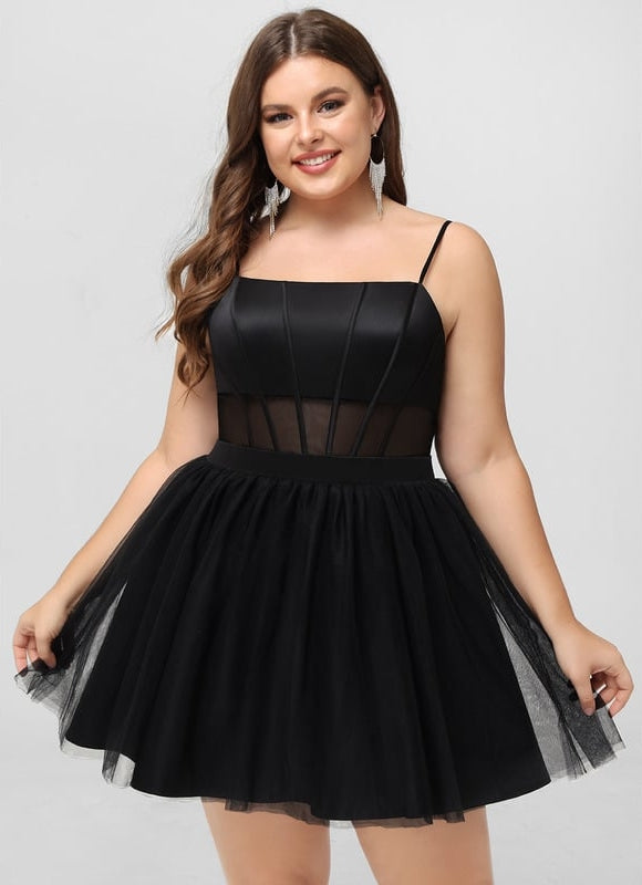 Succombez au charme de cette robe trapèze qui met en valeur votre silhouette de manière élégante et raffinée. Le bustier structuré en satin, doté d'un col carré moderne et de délicates bretelles spaghetti, offre un maintien parfait et une touche de glamour subtile. Des panneaux en maille transparente ajoutent une dimension sensuelle et contemporaine au bustier, tandis que la jupe courte et vaporeuse en tulle apporte une légèreté et un mouvement féerique. Chaque détail est pensé pour créer une harmonie parfaite entre audace et délicatesse, faisant de cette robe un véritable atout pour votre garde-robe de soirée.